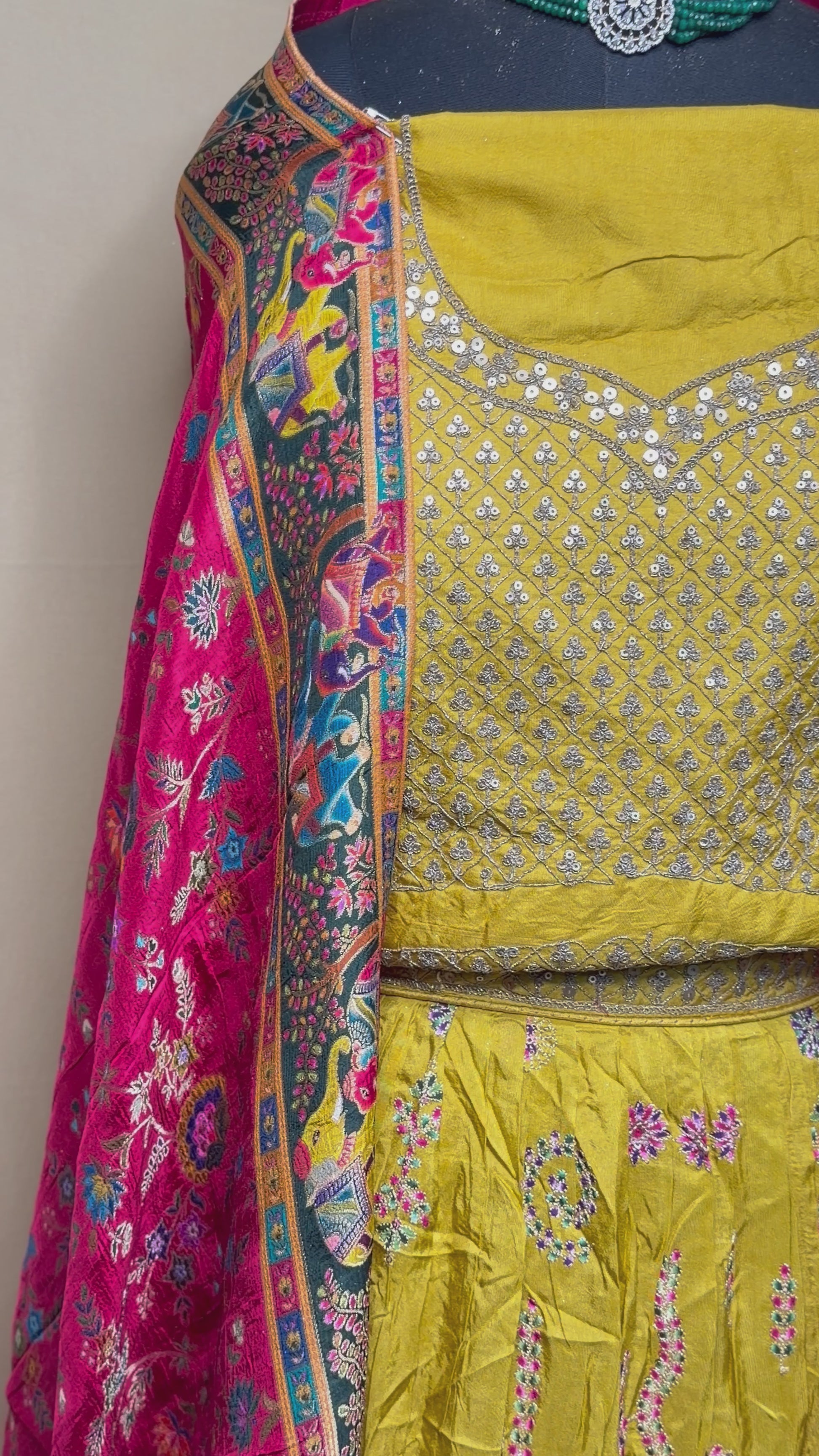 Elevate your wardrobe with our luxurious Pashmina lehanga. Made from high quality Pashmina material, this lehanga will keep you warm and stylish all at once. Embrace the timeless elegance of this traditional garment and make a statement at any occasion.